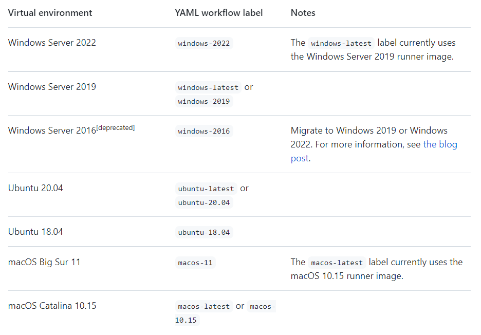 아래는 현재 github actions에서 지원하는 환경들의 목록과 그에 대응되는 인자값입니다.