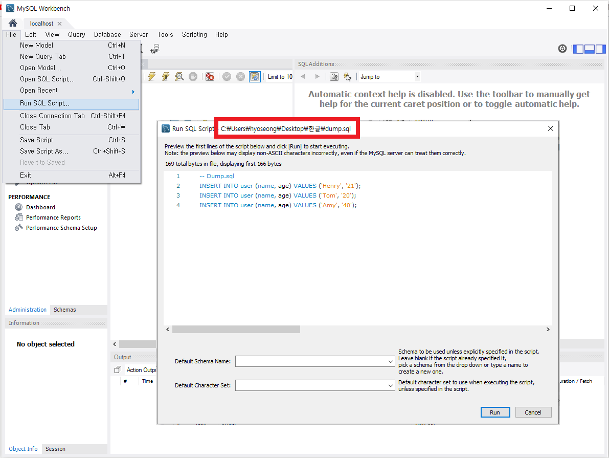 위의 sql파일을 Workbench에서 Run SQL Script 하였습니다.