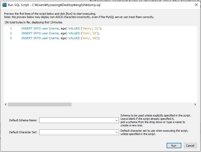 최근 sql파일을 실행시켜 DB에 데이터를 추가해야하는 일이 있었습니다.
